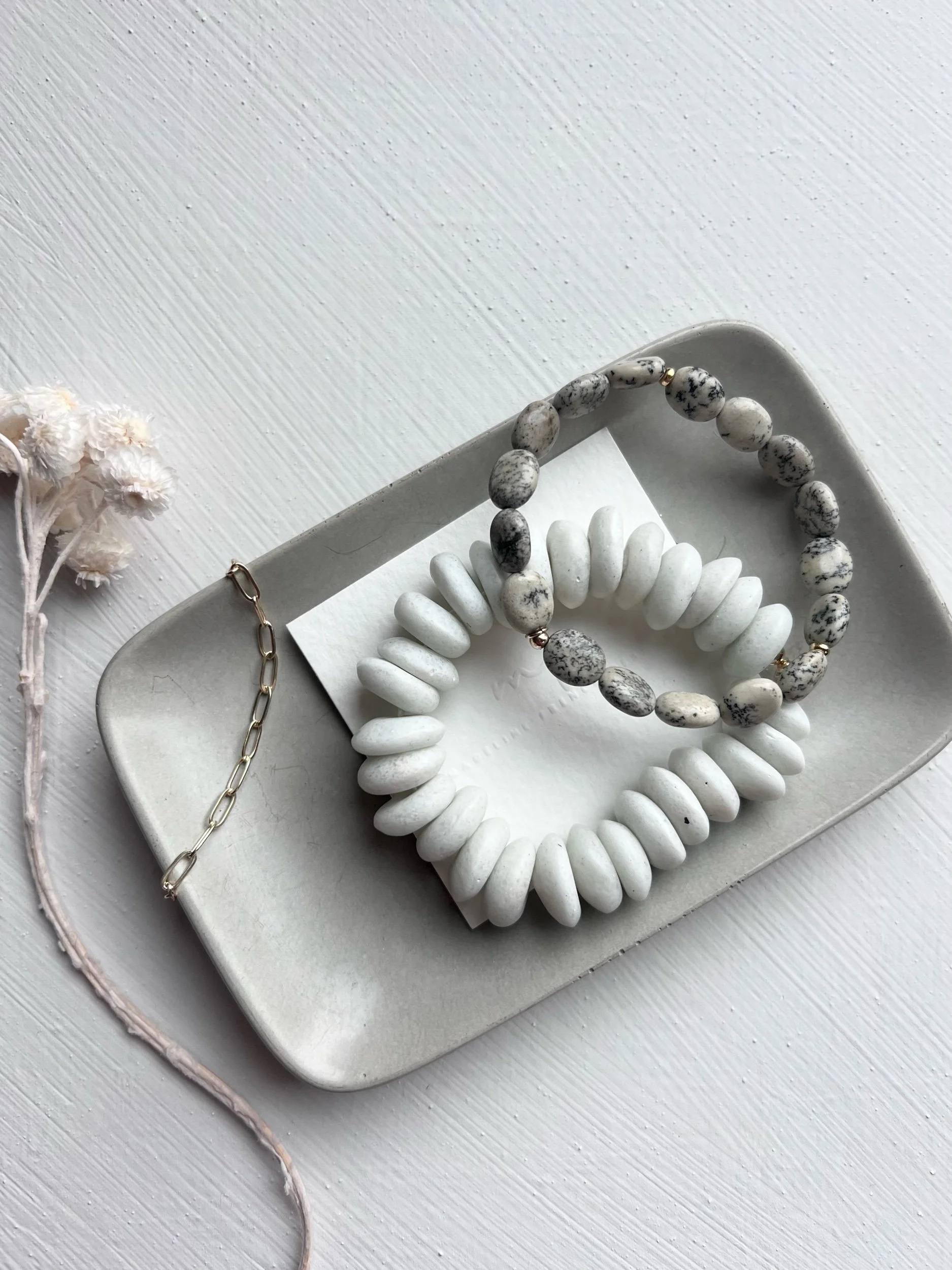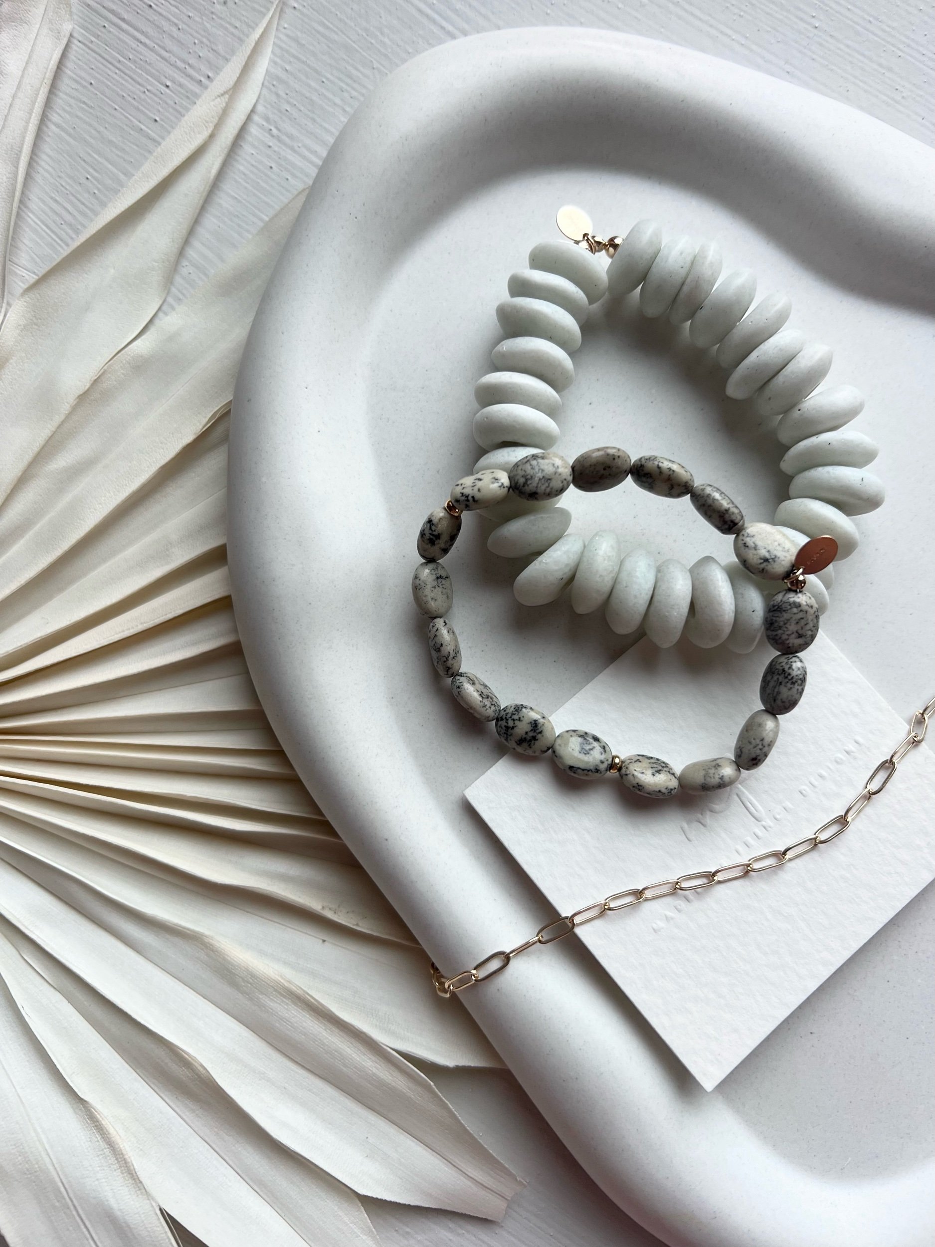 Organic. Soft. Bold with the most neutral colors! This set has a soft stone feel, and is one of a kind! Made with a 10mm oval Dalmatian Jasper bead bracelet on stretchy cord, a bold 15mm glass white saucer bracelet on stretchy cord, and a gold filled paperclip link chain bracelet (magnetic clasp). Wear each bracelet alone or all together for a fun stack!